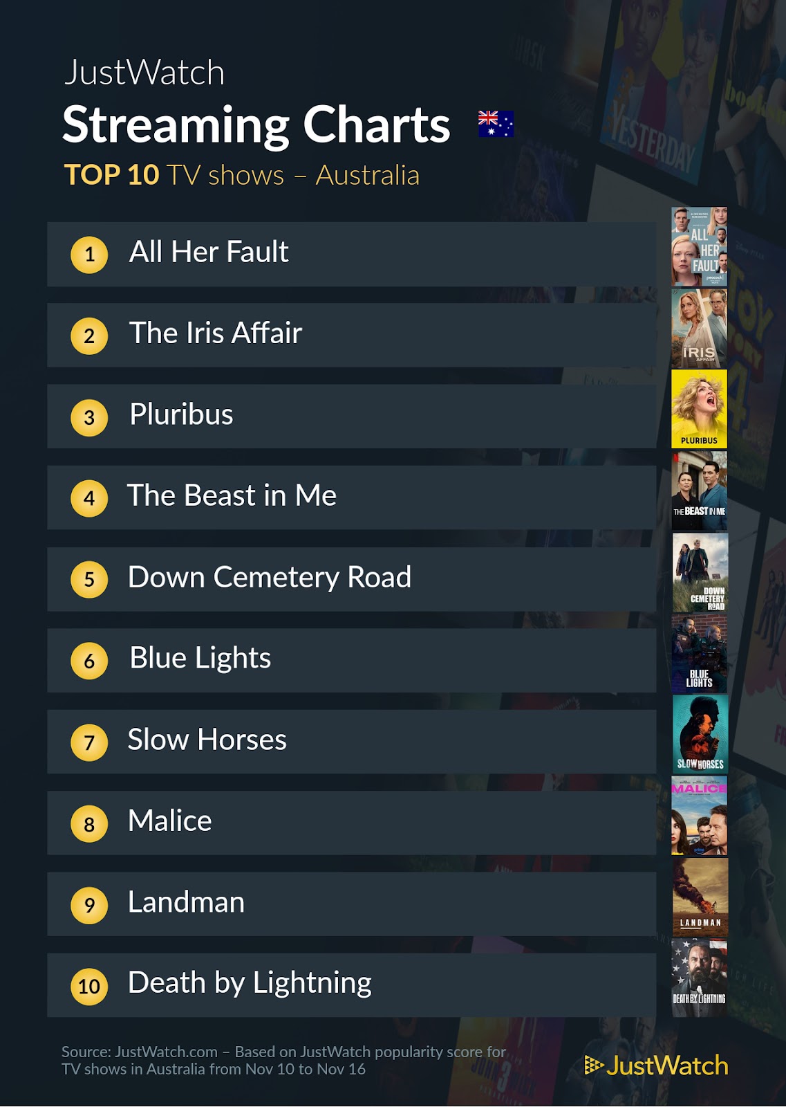The new season of "Landman" (Paramount+) debuts in 9th, while the Netflix historical miniseries and another great watch, Death by Lightning, was 10th.